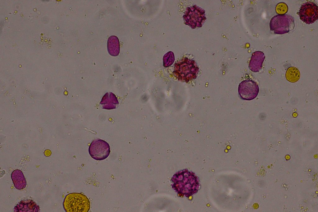 Pollen slides are then observed under a light microscope (x400 magnification) where pollen grains appear bright pink! The picture below shows pollen grains with different sizes, shapes and ornamentation found on the same slide. The pollen grains are classified into morphotypes based on their features.